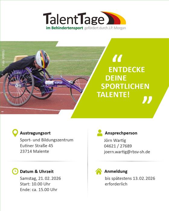 Datum: 09.01.26 Verfasser: Oliver ZummachLiebe Verbands-/Vereinsvorstände, liebe Trainerinnen und Trainer, liebe Sportlerinnen und Sportler,wir wünschen allen einen guten Start ins Jahr 2026 und hoffen, dass wir gemeinsam Viele und Vieles bewegen können.Beginnen wollen wir 2026 unter anderem mit dem Para Nachwuchssport!Am 21.02.2026 findet von 10-15h in Malente wieder ein TalentTag statt.Wir suchen junge Menschen mit Beeinträchtigung die Lust auf Nachwuchs- und Wettkampfsport in den SportartenPara Judo, ID Judo,Para Leichtathletik,Para Schwimmen,Rollstuhlbasketball undPara Tischtennis haben.Der TalentTag bietet jungen Menschen den Einstieg in den Behindertensport. Diejenigen, die bisher noch keinen Kontakt zum organisierten Sport hatten, können erste Erfahrungen und Eindrücke sammeln.Sportlerinnen und Sportler, die bereits in eurem Verein/Verband eine Sportart betreiben, können mit unseren erfolgreichen Parasportlerinnen und Parasportlern weitere Erfahrungen sammeln.Wer noch unsicher ist, kontaktiert uns einfach per Mail joern.wartig@rbsv-sh.de oder Telefon 04621 27689.Wir kommen auch gern einmal bei Euch vorbei, um uns und unsere Landesnachwuchs- und -leistungssportarbeit vorzustellen und erste Kontakte zu ermöglichen.Es ist uns völlig bewusst, dass gerade der Parasport von guten Kontakten zwischen Sporttreibenden und Übungsleitenden lebt! Darum gebt euren Sportlerinnen und Sportlern und uns eine Chance des Kennenlernens. Kommt zum TalentTag!Mit sportlichen Grüßen gez. Jörn Wartig(Geschäftsstelle RBSV S-H) Dateianhang: Flyer-Malente 2026 _Web.pdfDateianhang: TalentTag Malente 2026 Anmeldeformular.docx |